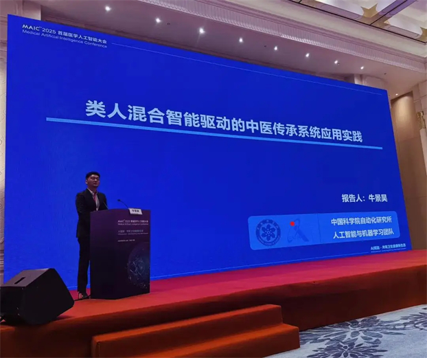 中国科学院自动化研究所副研究员牛景昊作“类人混合智能驱动的中医传承系统应用实践”主题演讲,依托类人混合智能技术,展示中医传承系统的落地案例,将前沿科研成果与中医传承需求紧密结合。