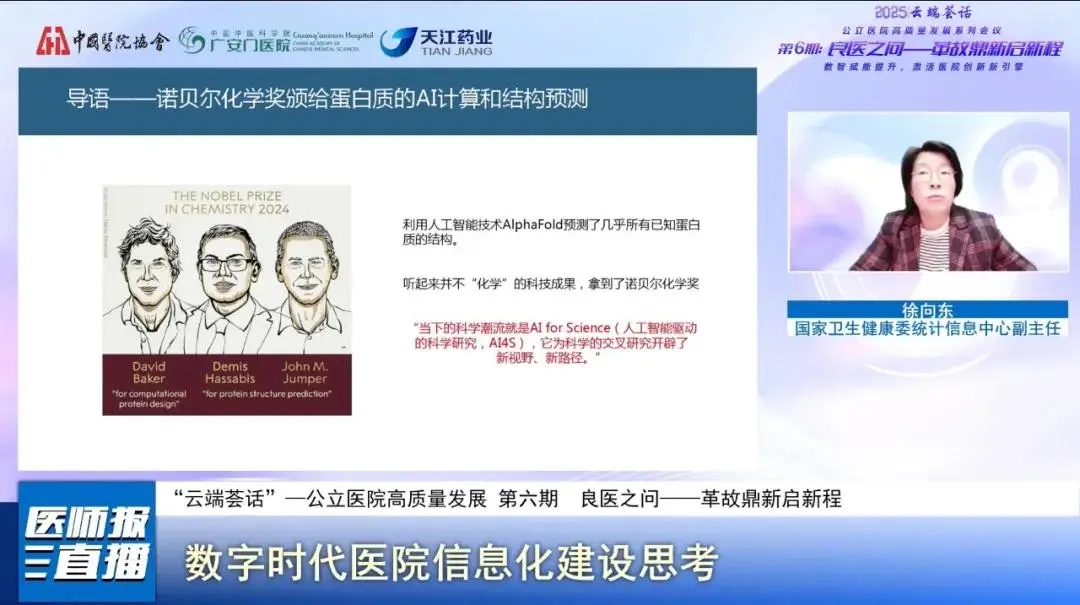 徐向东副主任在报告中系统阐述了新时代人工智能技术背景下医院数字化转型的方法论。从管理、业务、价值与技术四个维度,深入剖析了转型的构成要素、关键环节与实施路径,生动勾勒出医疗与人类生存、学习、生产及工作深度融合的发展图景,为医院在数字时代的演进方向提供了重要启示。