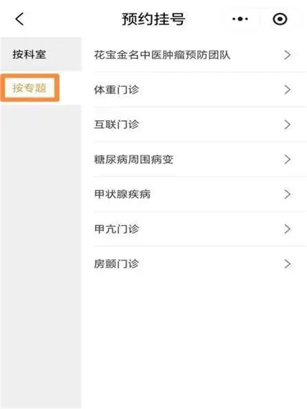 预约界面展示方式除按科室展示号源外,我院APP/微信小程序新增“按专题”展示方式,方便您根据专病专题快速查找并锁定目标号源,持续提升预约挂号体验。