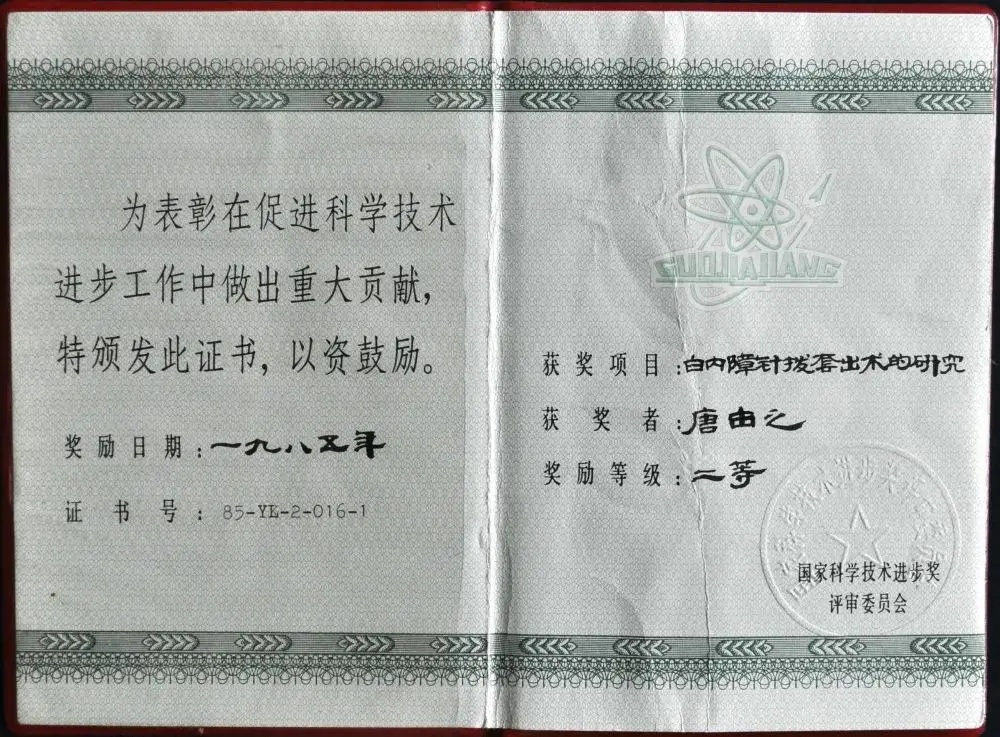 1985年,“白内障针拨套出术的研究”获得国家科学技术进步奖二等奖