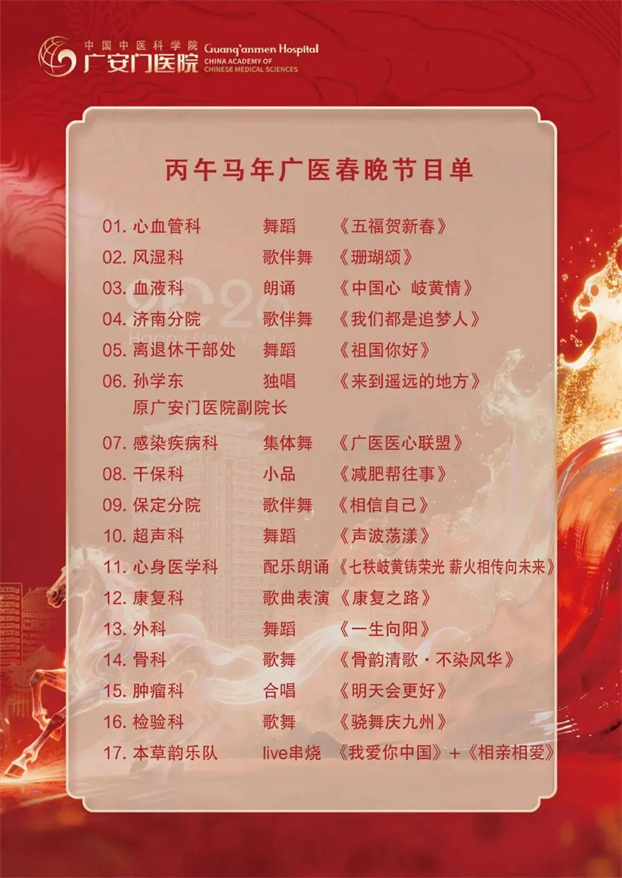 律回春渐,新元肇启;七秩荣光,医心致远。1月29日,以“策马扬鞭征万里、七秩风华耀九州”为主题的2026广医春晚如期而至。医院领导班子、离退休老专家、一线医护人员、职工家属及各院区代表齐聚一堂,以艺传情、以歌明志,回望七十载岐黄深耕路,共绘新一年奋进新蓝图,在欢声笑语中凝聚起“广安广博、至精至诚”的磅礴力量,奏响中医药传承创新的时代乐章。