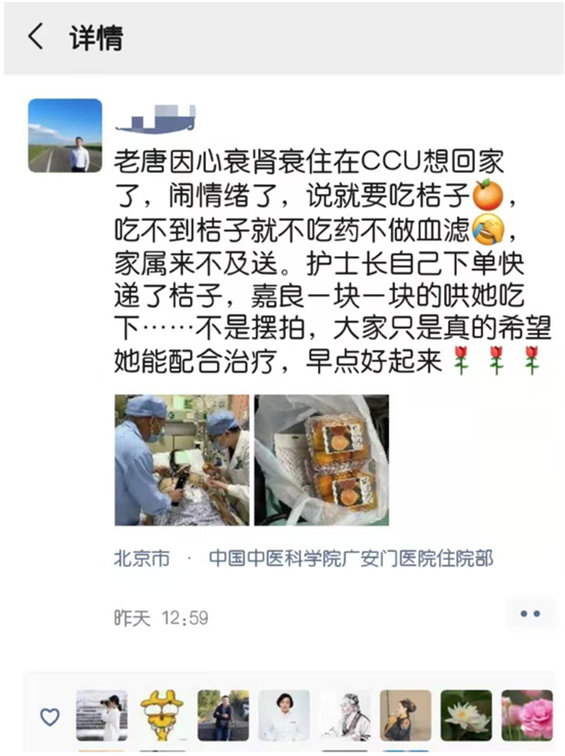 吃着酸甜可口的桔子,听着医护的耐心疏导,老唐的情绪慢慢平复,配合的服下了药物,血滤治疗也能平稳进行,刺耳的报警声不再回响。