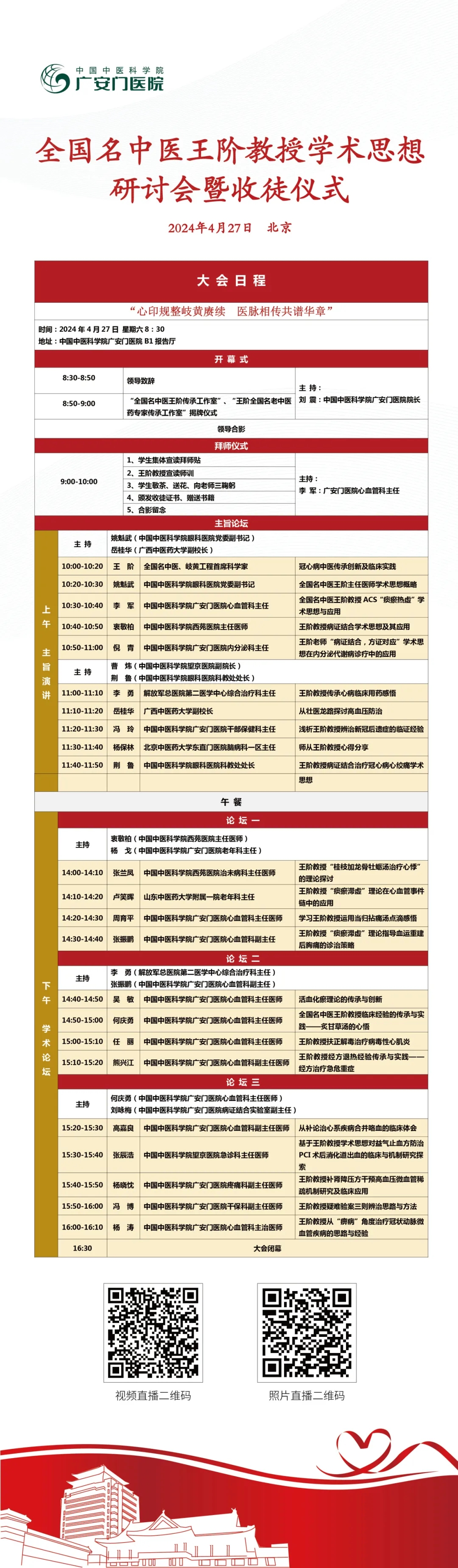 为传承全国名中医王阶教授学术思想,促进中医药传承创新发展,深入开展心血管疾病的中西医结合研究,由中国中医科学院广安门医院心血管科主办,全国名中医王阶传承工作室和王阶全国名老中医药专家传承工作室承办,“全国名中医王阶教授学术思想研讨会暨收徒仪式”将于4 月27日(本周六)召开。