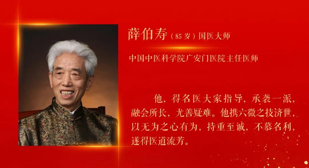 Xue Boshou, 85 years old, is a medical professor of Guang'anmen Hospital, China Academy of Chinese Medical Sciences, doctoral supervisor, expert with outstanding contribution in 1986, national medical ethics model, and national master of traditional Chinese medicine(TCM). He ever studied under the leading TCM doctor Pu Fuzhou for 13 years, and has always implemented the instructions of Premier Zhou Enlai: "Inherit, carry forward, and promote Pu's medical experience for the benefit of the people." He has cultivated many talents and won the inheritance award three times. He is good at TCM, especially at treating heat syndrome. He has made outstanding contributions in the diagnosis and treatment of AIDS, falciparum malaria, SARS and COVID-19 by TCM.