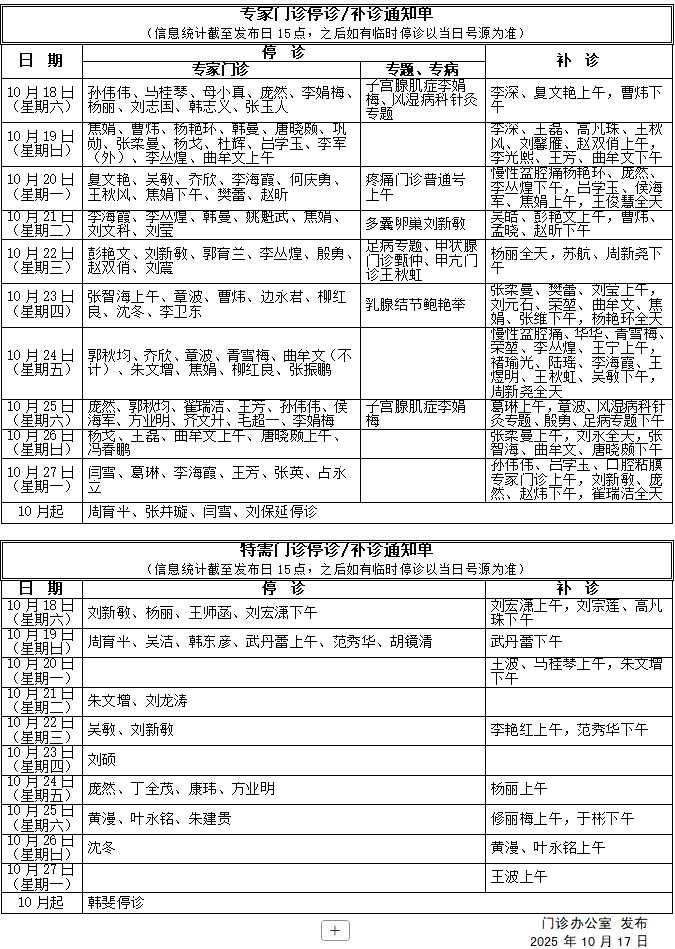 广安门医院专家门诊停诊/补诊通知单