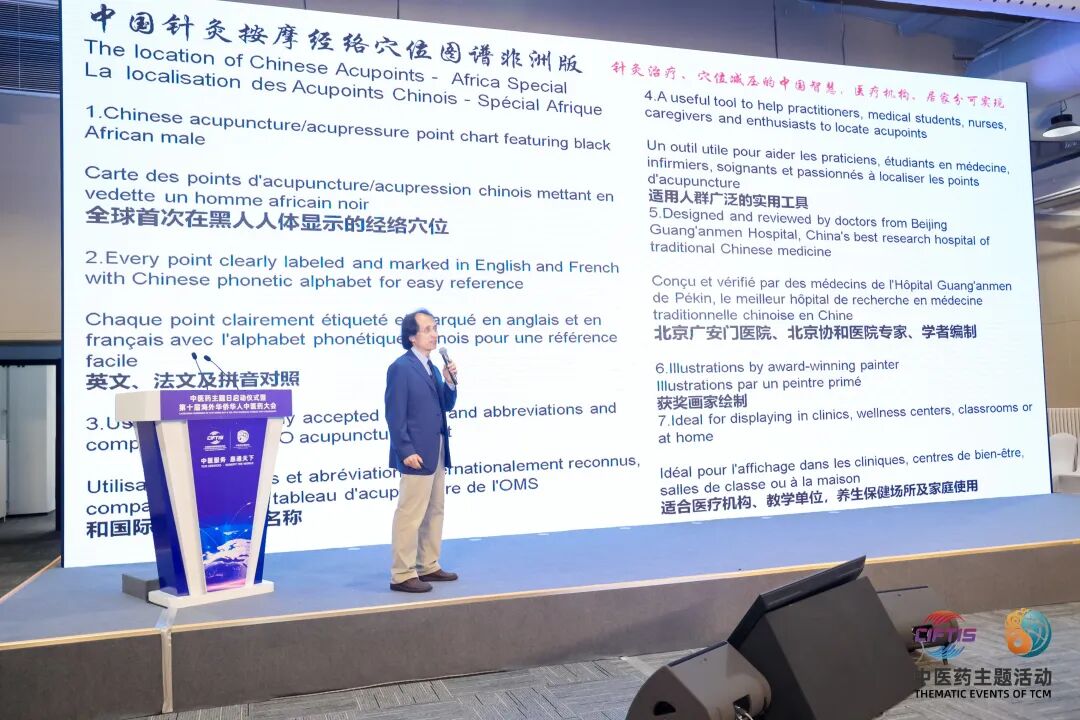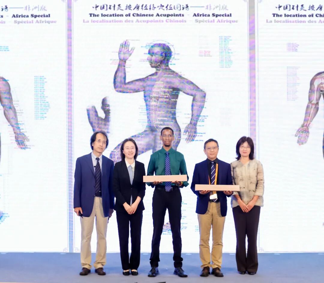 外文出版社出版的《中国针灸按摩经络穴位图谱——非洲版》在大会成果发布环节首发。杨春燕和北京市中医药管理局副局长李德娟向首都医科大学附属北京中医医院副院长、援非医疗队队长郭伟,北京语言大学国际中文学院马里研究生赛亚平赠送图谱。